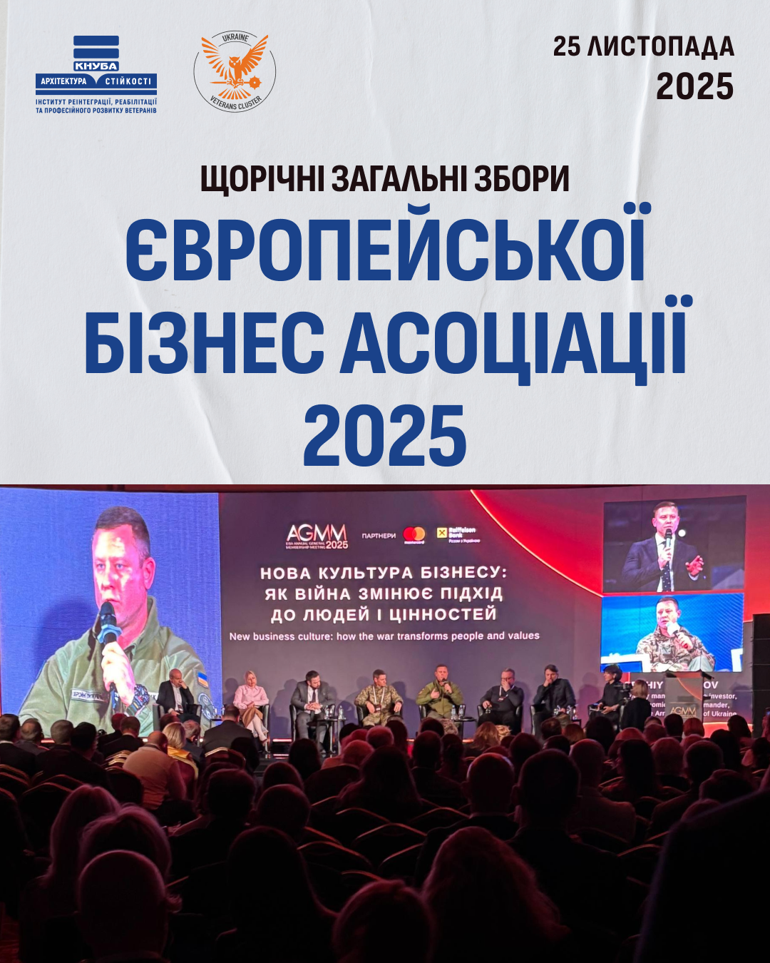 25 листопада відбулись щорічні загальні збори Європейської Бізнес Асоціації. Захід об’єднав керівників бізнесу, представників державних органів та міжнародних партнерів України. Учасники зборів підбивали підсумки року, обмінювалися новинами та ідеями. Однією із найбільш важливих і чутливих тем для обговорення стала нова культура бізнесу і те, як війна змінює підхід до людей і цінностей. Своїми думками з цього приводу і напрацюваннями Інституту ветеранів “Архітектура стійкості” з присутніми ділився заступник керівника Інституту ветеранів Євген Комаров.