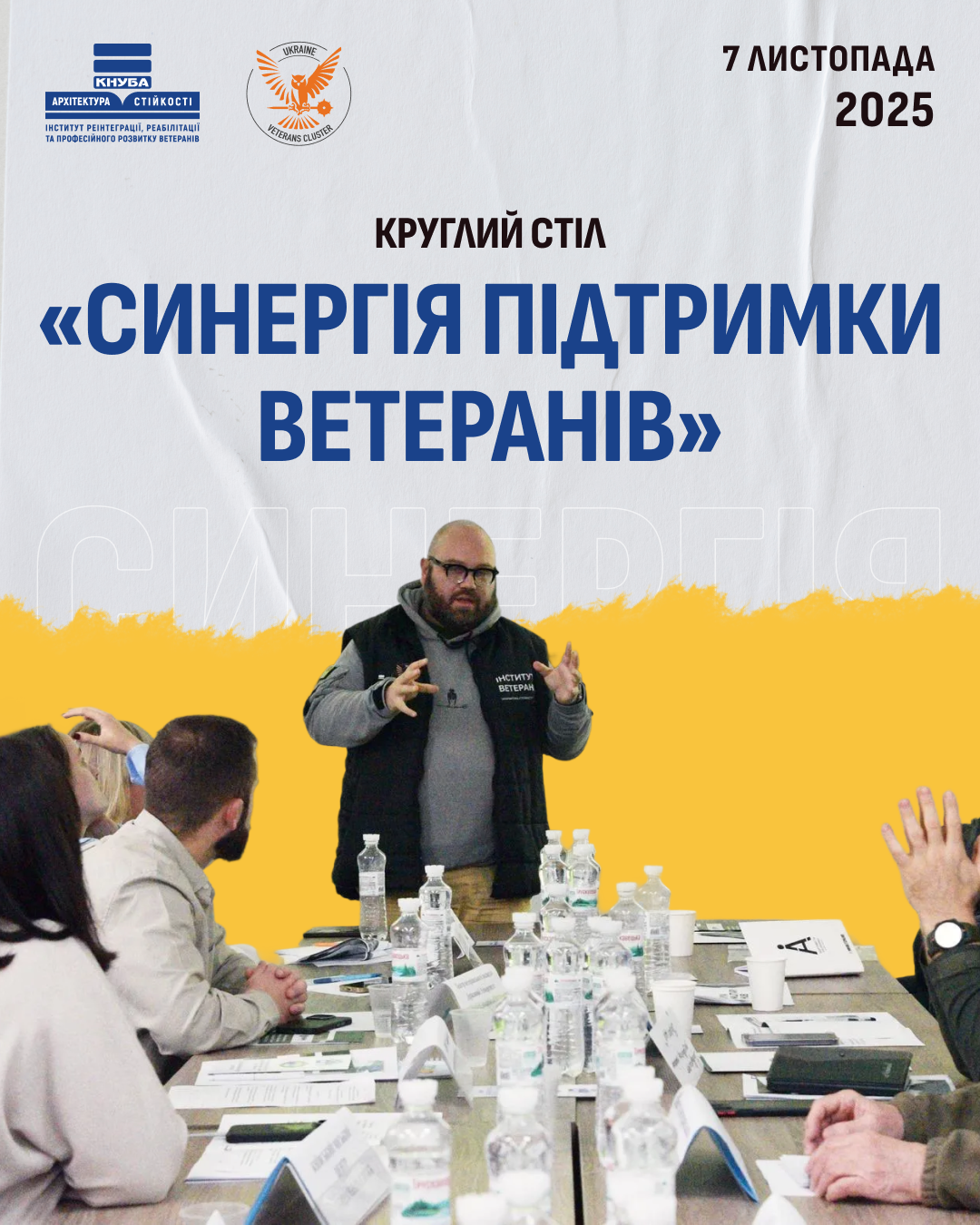 7 листопада заступник керівника Інституту ветеранів «Архітектура стійкості» КНУБА презентував діяльність інституту під час круглого столу про синергію дій заради підтримки Захисників і Захисниць України. Захід об’єднав представників соціальних служб, ветеранських просторів, освітніх закладів, профспілок. Учасники круглого столу говорили про те, як забезпечити дієву підтримку ветеранів, ветеранок та їхніх сімей, створити можливості для навчання, професійного розвитку і подальшого працевлаштування. Також присутні зауважували, що роботодавці мають забезпечувати ветеранам гідні умови праці.