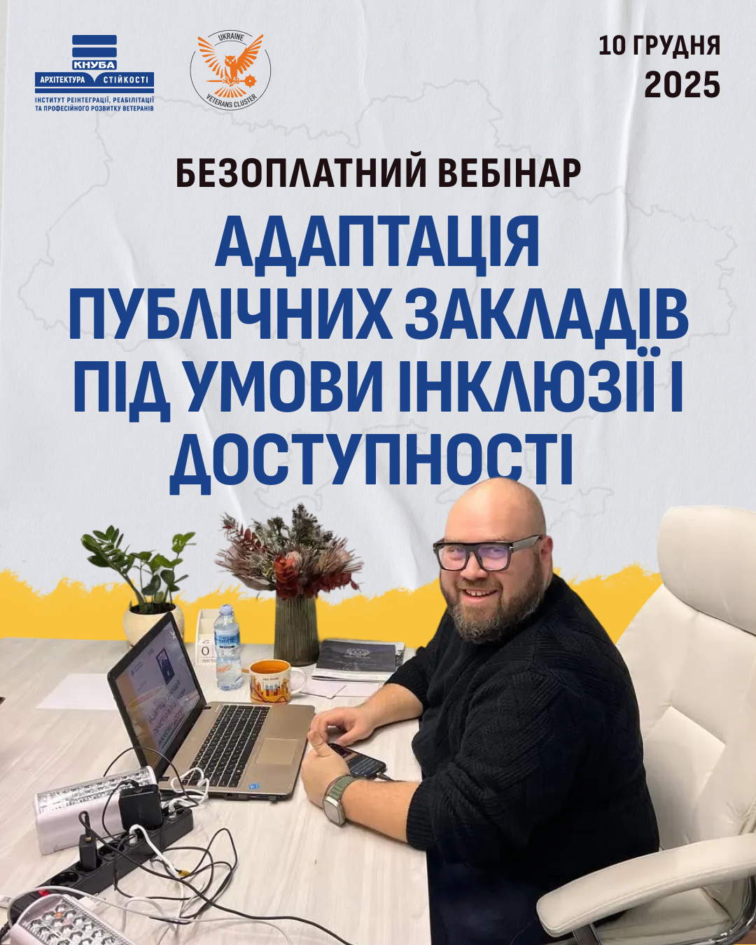 Заступник керівника Інституту ветеранів “Архітектура стійкості” Євген Комаров провів безоплатний практичний вебінар для керівників публічних закладів, представників громад, інженерів, архітекторів, соціальних працівників та громадських активістів на тему «Адаптація публічних закладів і просторів для доступності та інклюзивності: прості рішення для реальних змін». Під час вебінару розглянули ключові нормативні акти, які регулюють вимоги до доступності публічних просторів. Принципи інклюзивної навігації: таблички, контрастність, позначення, зрозумілі маршрути та інші елементи, що допомагають людям орієнтуватися у просторі. Говорили про реальні кроки, з яких можна почати вже сьогодні. Участь у вебінарі була безоплатною, лише за реєстрацією.